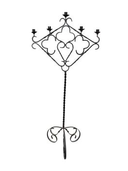 Two wrought iron candle stands, larger width 75cm, height 169cm, width 62cm, height 168cm