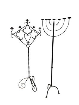 Lot 1072 , Two wrought iron candle stands, larger width 75cm, height 169cm, width 62cm, height 168cm
