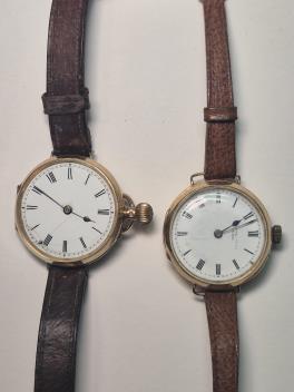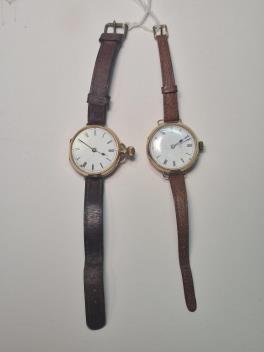 Lot 912 , A late Victorian 18ct gold wrist watch (converted from an open face pocket watch) by Bowman Ltd, London, on a leather strap, gross weight 42 grams, together with an Edwardian 18ct gold wrist watch(converted from an open