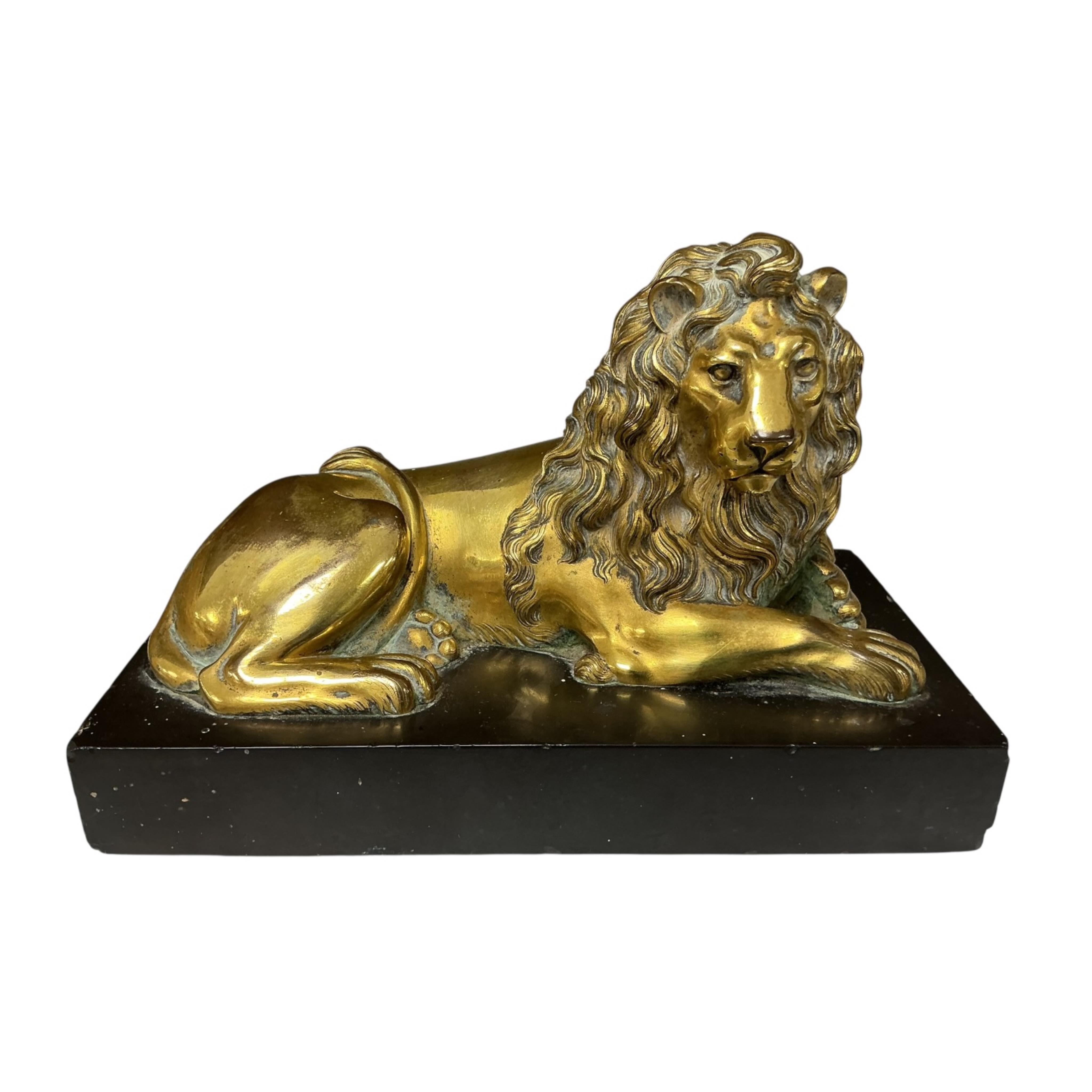 A gilt bronze of a recumbent lion, on rectangular slate base, 18cm wide