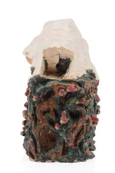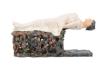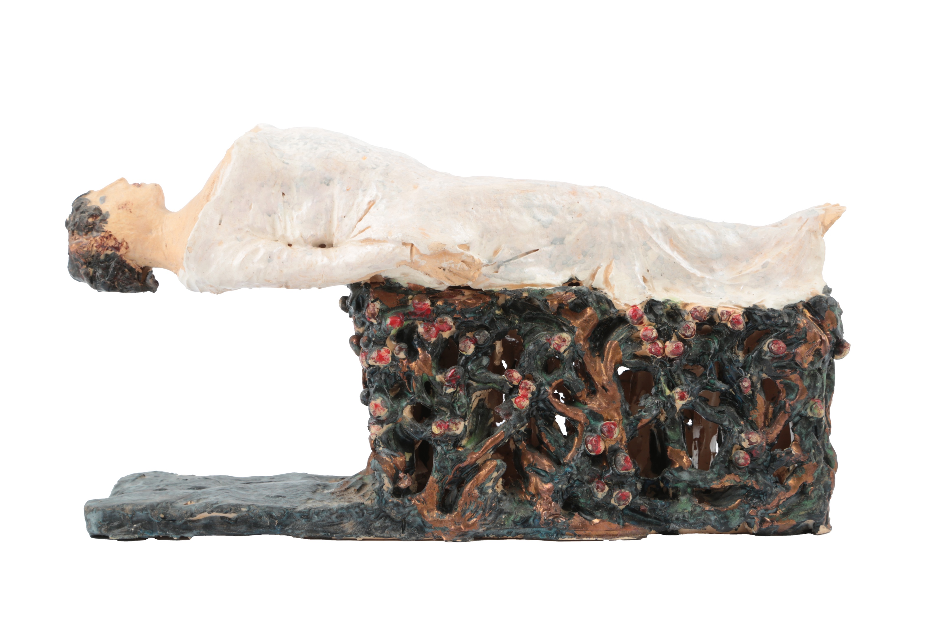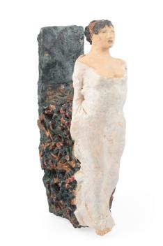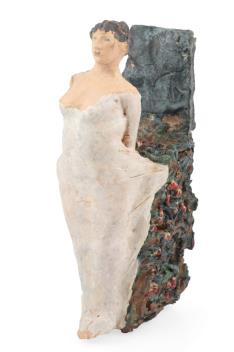 § Quentin Bell (1910-1996) for Fulham Pottery: A 'Levitating Woman' figure, her lower body resting on a naturalistic foliate pedestal, her upper half suspended in the air, painted earthenware, 34cm x 19cm x 10cm