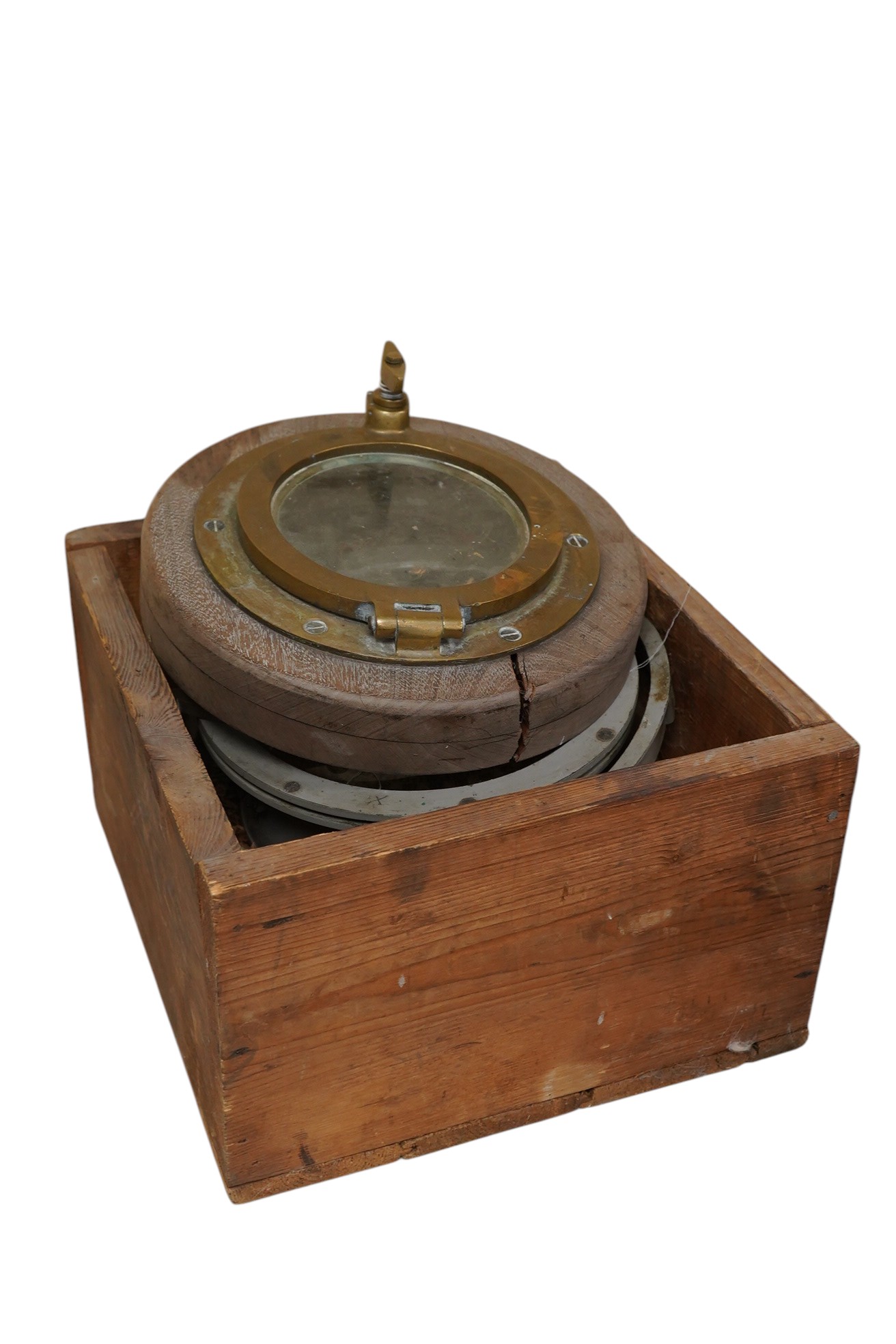 Lot 1429 , A marine compass and brass mounted hardwood porthole, largest 25cm in diameter