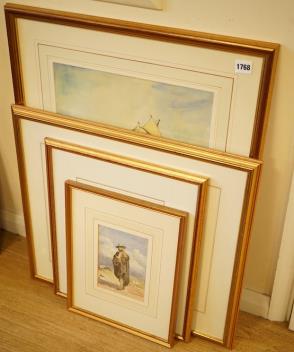 A collection of four watercolours to include J. Hardcastle, maritime watercolour, signed and dated 1910 and a study of a cloaked figure, largest 50 x 35cm