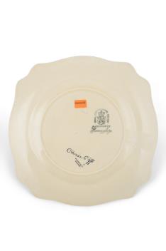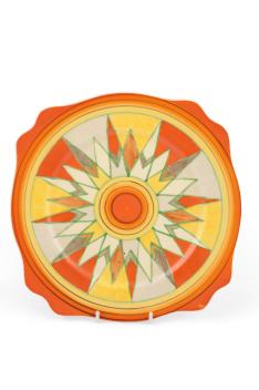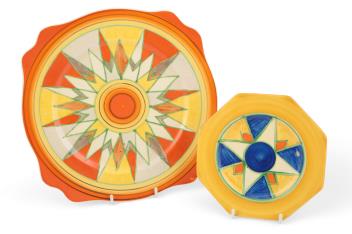 Lot 261 , Clarice Cliff: A Sungold plate and Sunburst side plate, 25cm diameter and a smaller Bizarre octagonal side plate