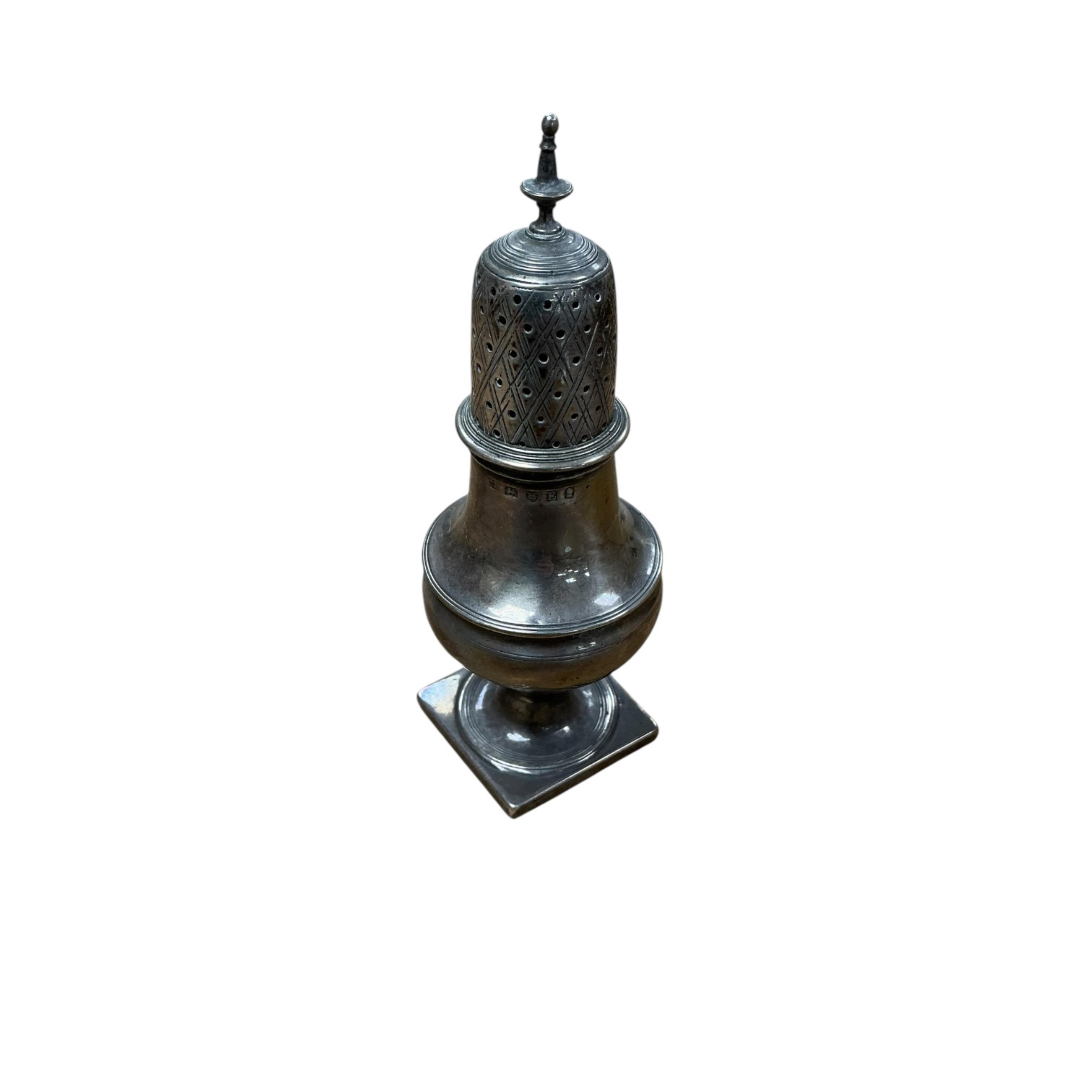Lot 1877 , A George III silver baluster pepperette, on square foot, by Crispin Fuller, London, 1800, 13.9cm, 82 grams,(repair).