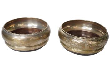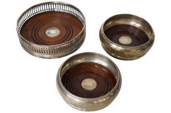 Lot 3825 , A pair modern silver mounted wine coasters by W.I. Broadway & Co, Birmingham, 2005, diameter 88mm, together with one other larger modern silver mounted wine coaster by Carr's of Sheffield.
