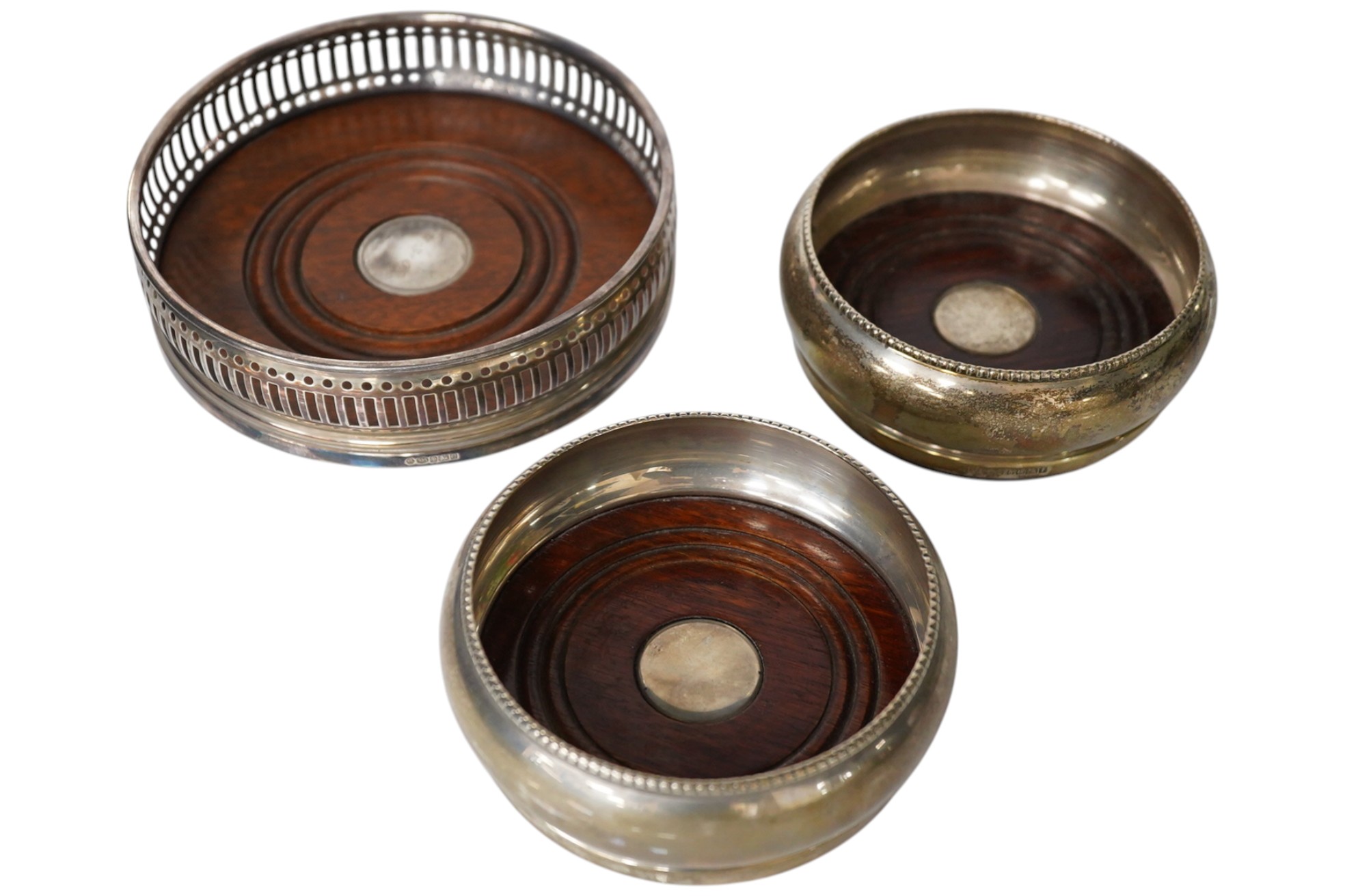 A pair modern silver mounted wine coasters by W.I. Broadway & Co, Birmingham, 2005, diameter 88mm, together with one other larger modern silver mounted wine coaster by Carr's of Sheffield.