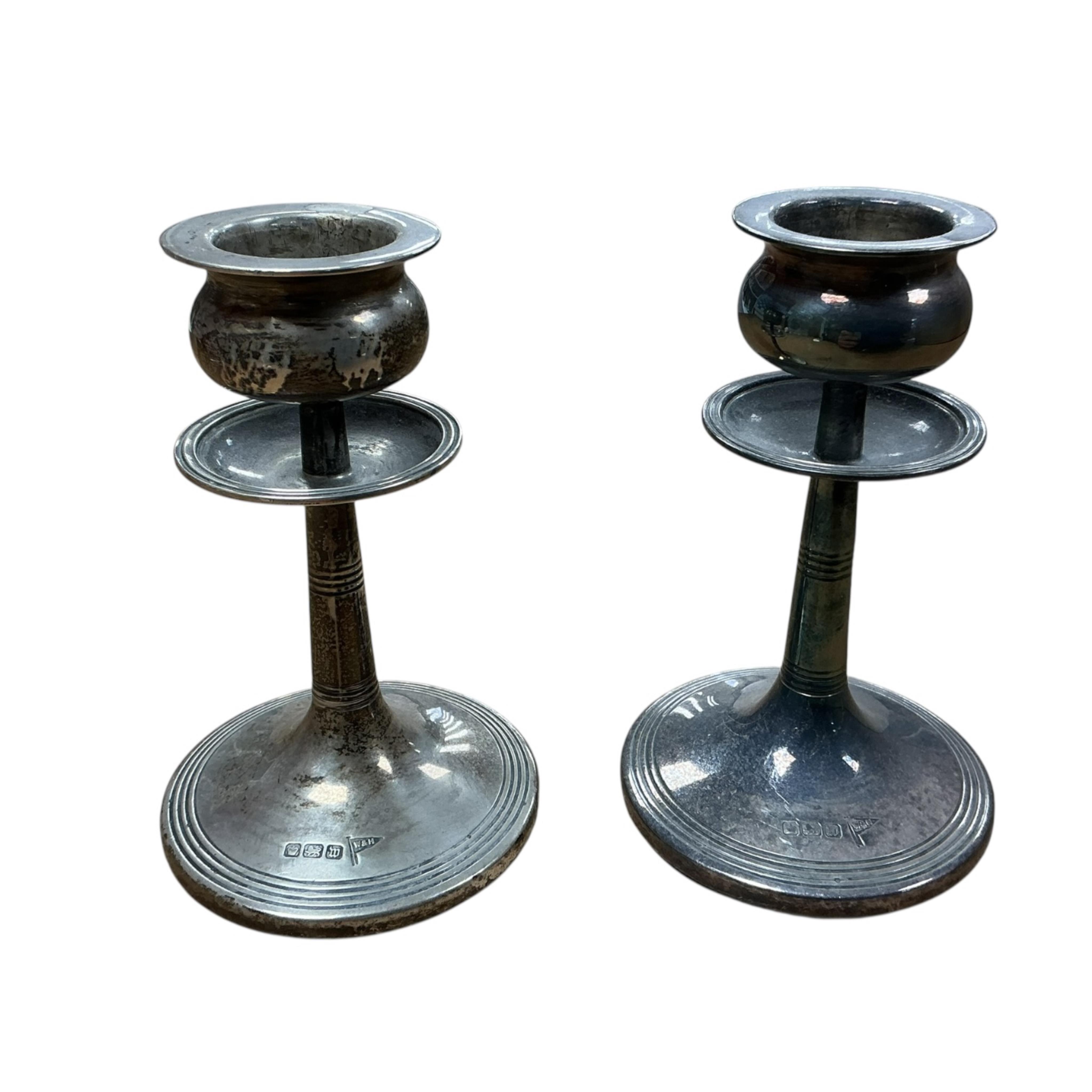 A pair of George V silver mounted dwarf candlesticks, by Walker & Hall, Sheffield, 1914, 10cm, weighted.