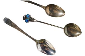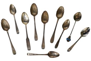 Lot 3829 , Four George III engraved Old English pattern silver shell bowl teaspoons, London, 1794 and six other silver teaspoons including four George III, George Gray, London, 1793 and Art Nouveau enamelled, probably James Fenton,