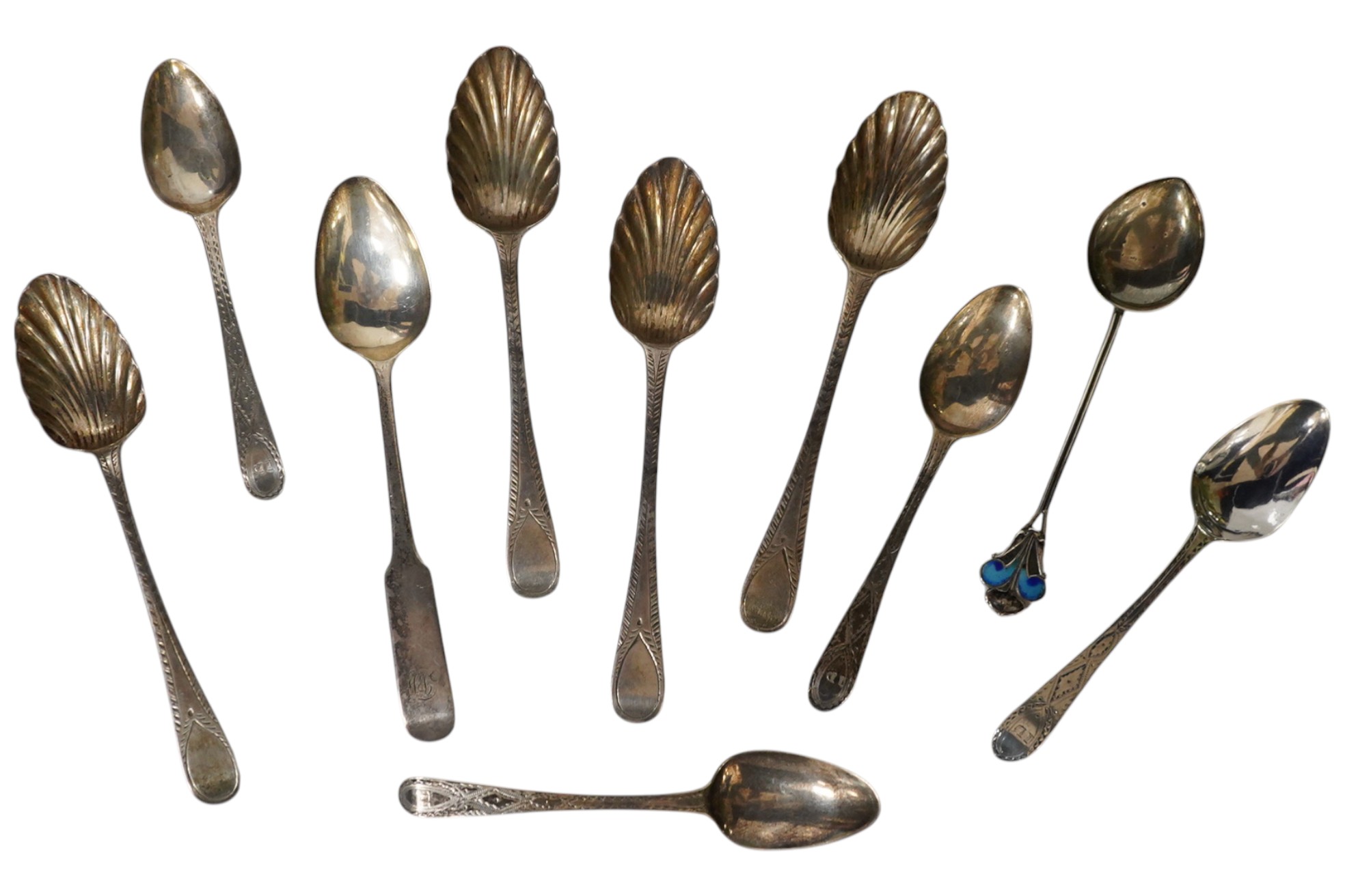 Four George III engraved Old English pattern silver shell bowl teaspoons, London, 1794 and six other silver teaspoons including four George III, George Gray, London, 1793 and Art Nouveau enamelled, probably James Fenton, Birmingham, 1906.