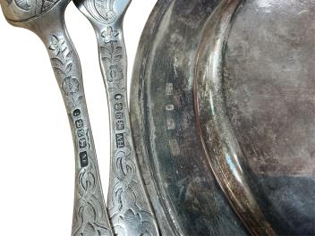 Lot 1839 , A Victorian engraved silver christening plate, fork and spoon, by Aaron Hadfield, Sheffield, 1848, plate diameter 15.6cm, 6.5oz.