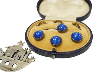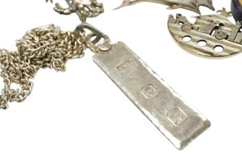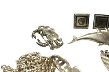 Lot 1932 , A collection of jewels, comprising: a silver ingot pendant on a white metal chain; three silver brooches designed as a crab, Noah's Ark and two dolphins respectively; a blue paste dress set; and a pair of silver cufflink