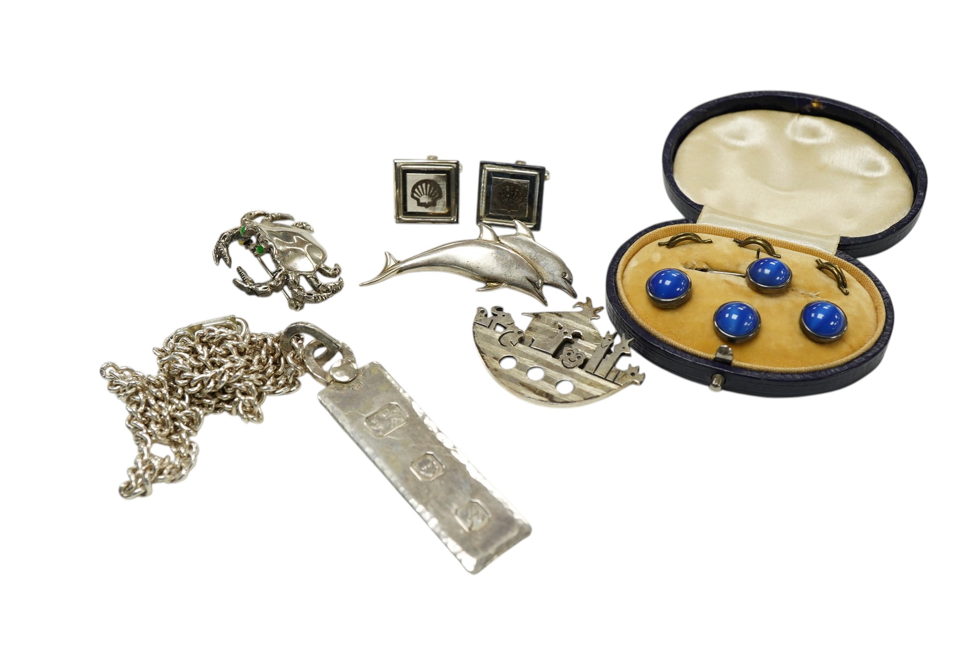 A collection of jewels, comprising: a silver ingot pendant on a white metal chain; three silver brooches designed as a crab, Noah's Ark and two dolphins respectively; a blue paste dress set; and a pair of silver cufflinks bearing the Shell logo, British hallmarks