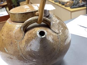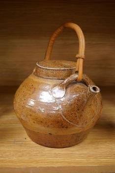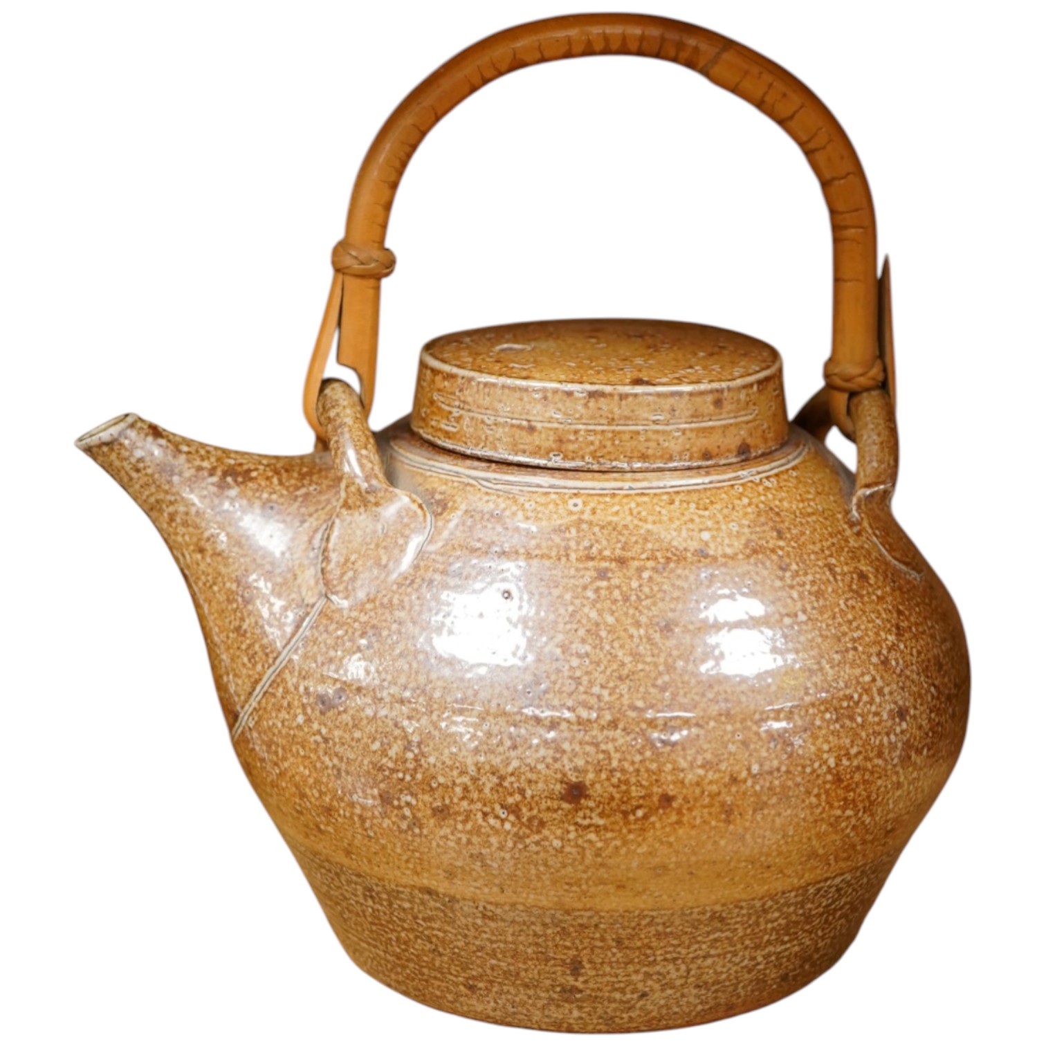 Lot 3147 , A Sarah Walton (b.1945) salt glazed studio pottery teapot and cover with bamboo swing handle, height 27cm.