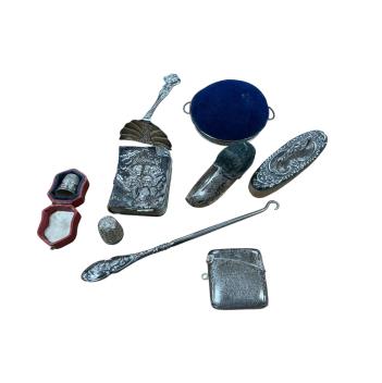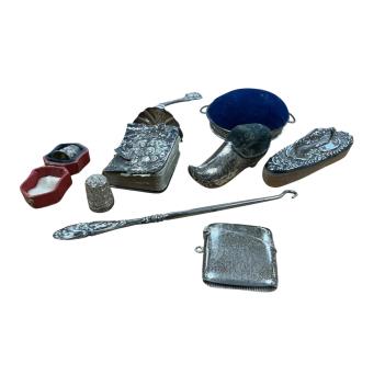 Lot 1869 , Sundry collectable silver including a George V mounted clog pin cushion, A&J Zimmerman, Birmingham, 1910, 70mm, a mounted nail buffer and button hook, a pusher, mounted basket pin cushion, two thimbles including one case