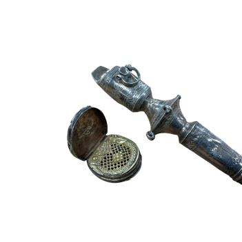 Lot 1870 , A George III engraved silver demi-lune shaped vinaigrette, with grille decoration with a dolphin, Cocks & Bettridge, Birmingham, 1812, 25mm, together with a George III silver child's rattle, by John Rich, London, 1792, w