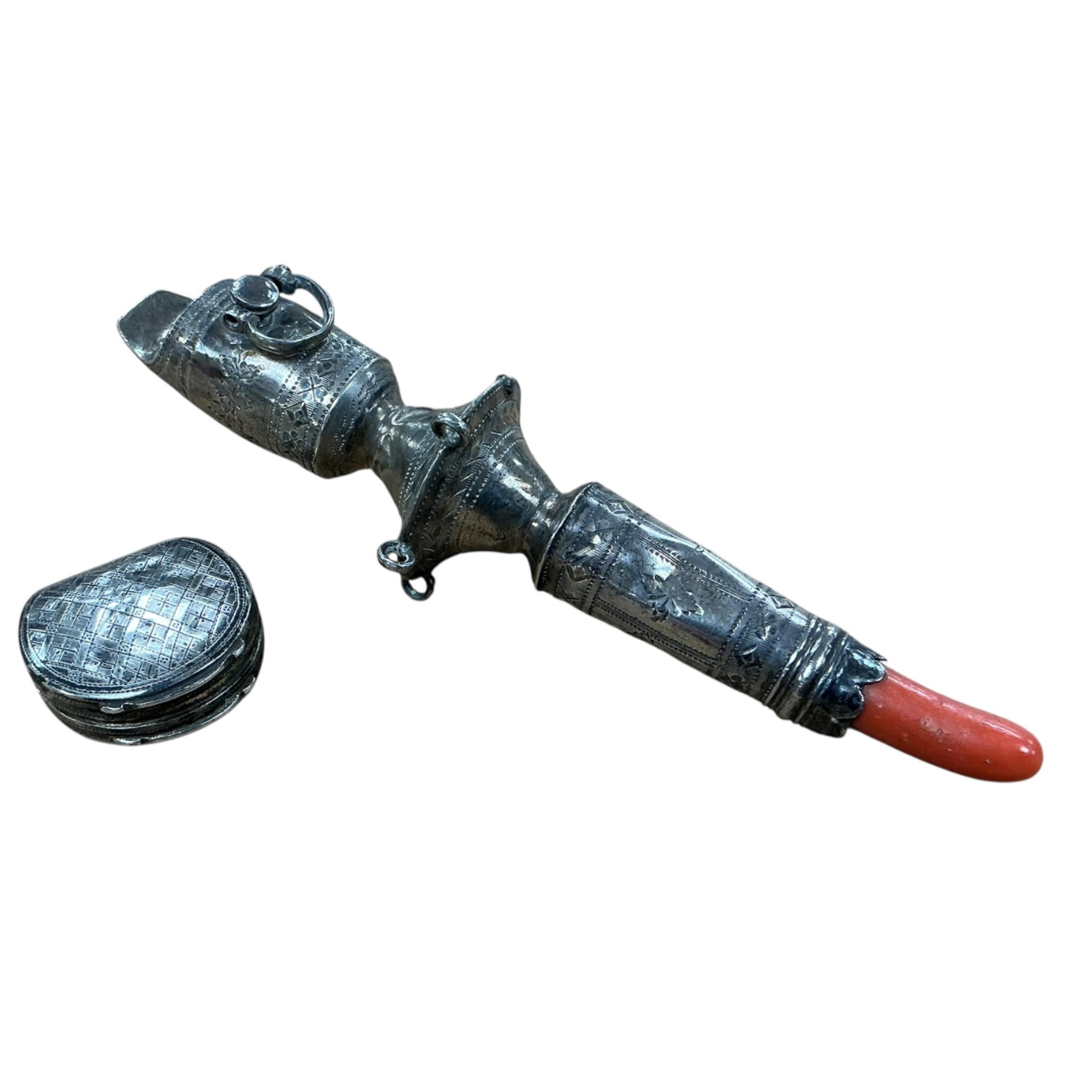 A George III engraved silver demi-lune shaped vinaigrette, with grille decoration with a dolphin, Cocks & Bettridge, Birmingham, 1812, 25mm, together with a George III silver child's rattle, by John Rich, London, 1792, with coral teether, lacking bells.