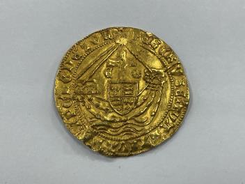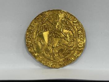 Lot 2089 , British hammered gold coins, Edward IV, second reign (1471-83), gold Angel, Tower Mint, London, S 2091, approx. 5.1g, St Michael killing dragon with lance, one foot on dragon, beaded circle surrounding, initial mark annu