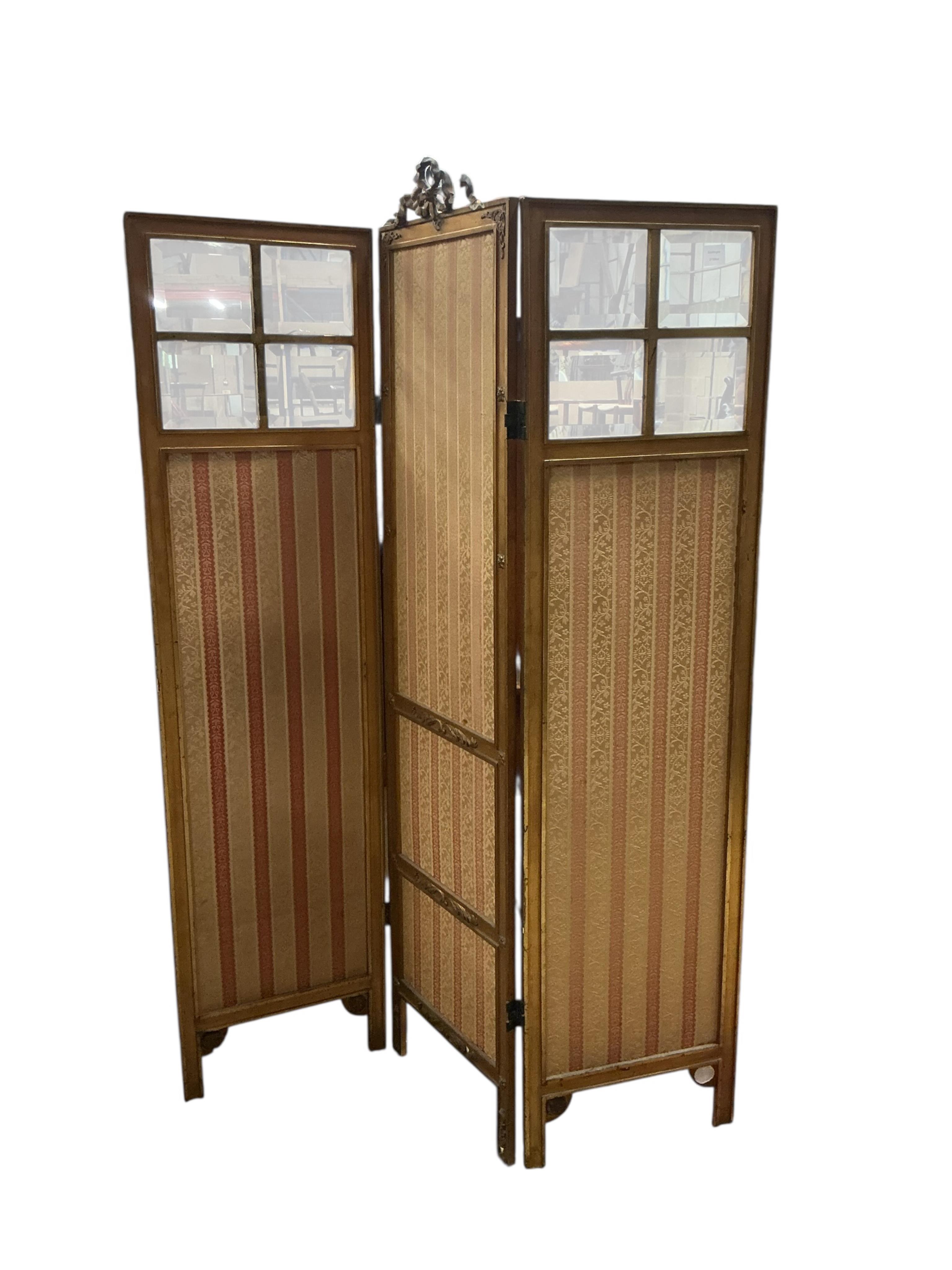 A late 19th century glazed giltwood three fold dressing screen, each panel width 45cm, height 184cm