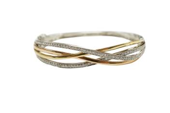 Lot 1912 , A diamond bangle, of hinged construction, the front section composed of crossed bands in tricoloured gold, pavé-set with brilliant-cut diamonds totalling approximately 1.00 carat, inner circumference approximately 17.5cm