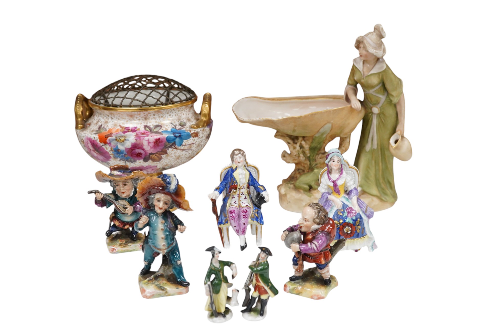 A mixed collection of porcelain to include a figural Royal Dux Bon Bon dish, a cauldron-form pot-pourri and Continental figures, largest 23cm high