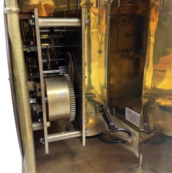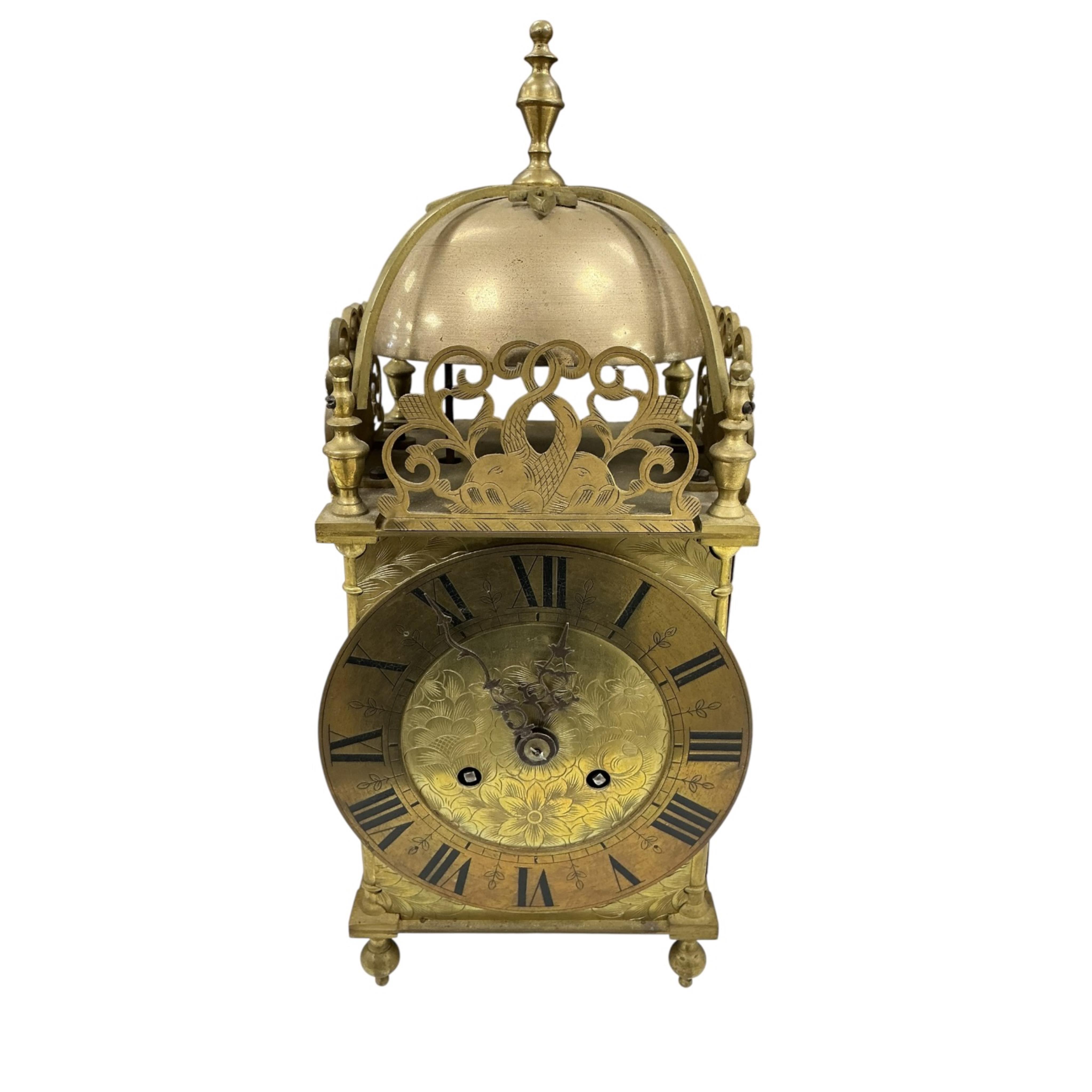 Lot 1308 , An early 20th century brass lantern clock engraved with flowers and dolphins, with key and pendulum, 37cm high
