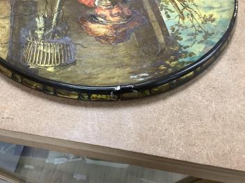 Heavily crazed glazed, areas with firing errors, glazed flaking around the edges, chip(s), dent(s) and restoration visible around the edges / rim, please see photos, overall image remains strong.