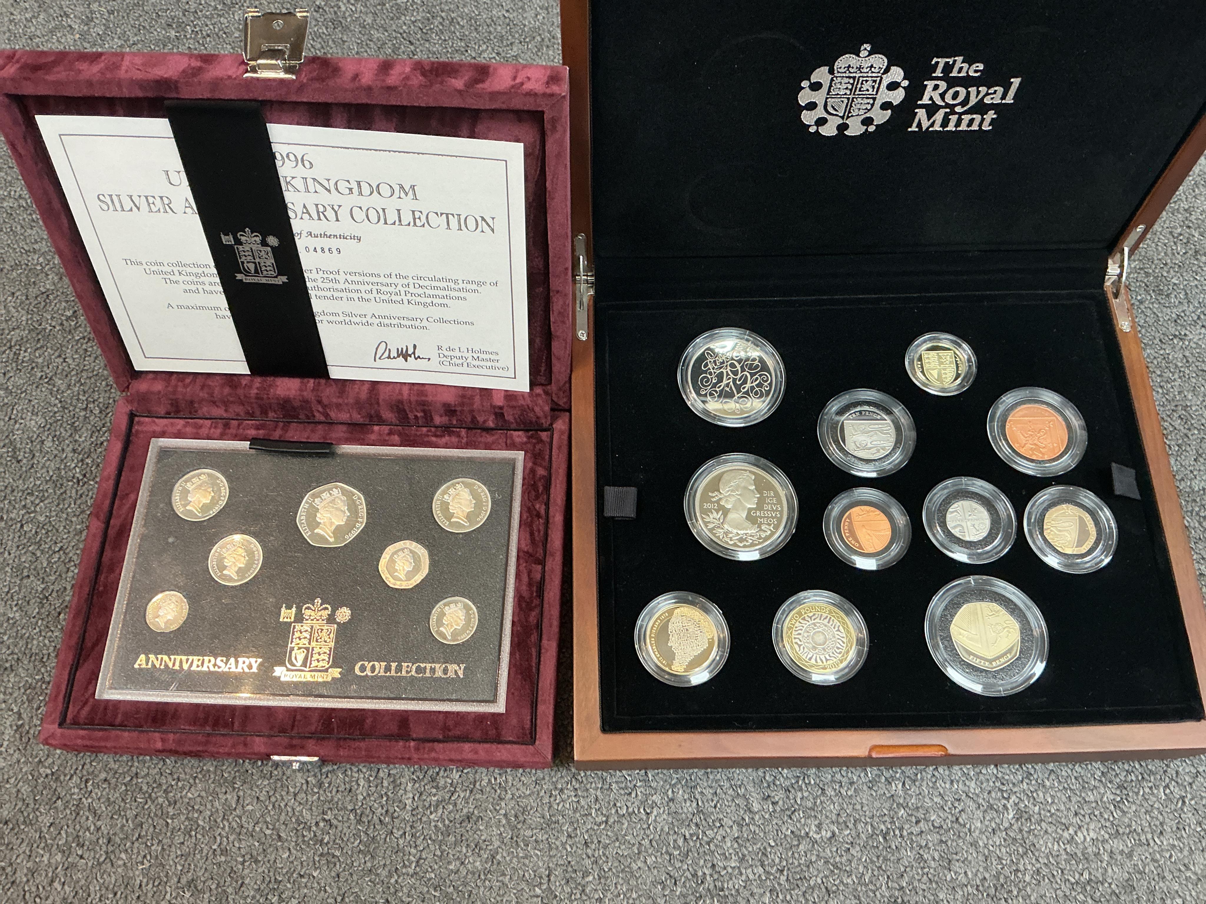 Lot 2011 , British coins, Elizabeth II, Royal Mint 1996 UK silver anniversary 7 coin collection, 50p to 5p, and, 2012 United Kingdom premium proof set, limited edition 3500, both in case of issue with certificate