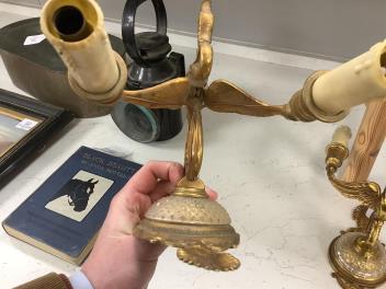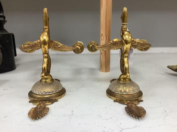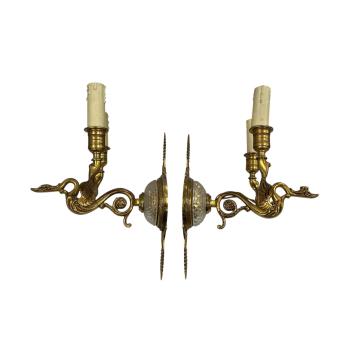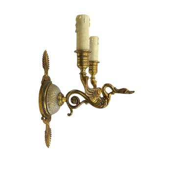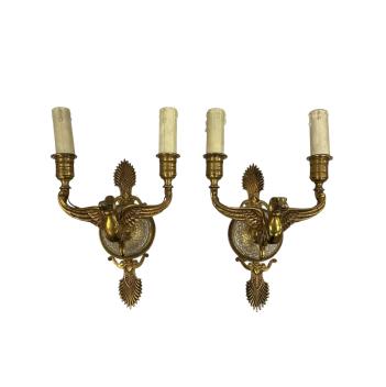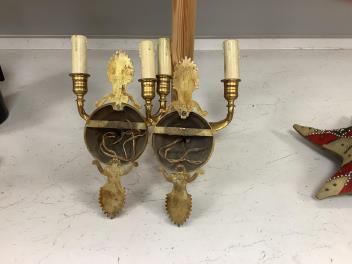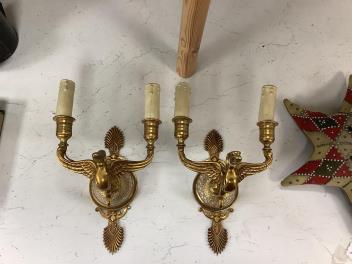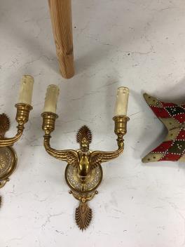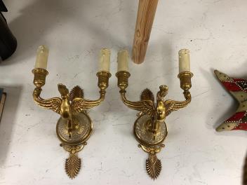 Lot 1338 , A pair of Empire style gilt brass and glass two branch wall lights, length 25cm.