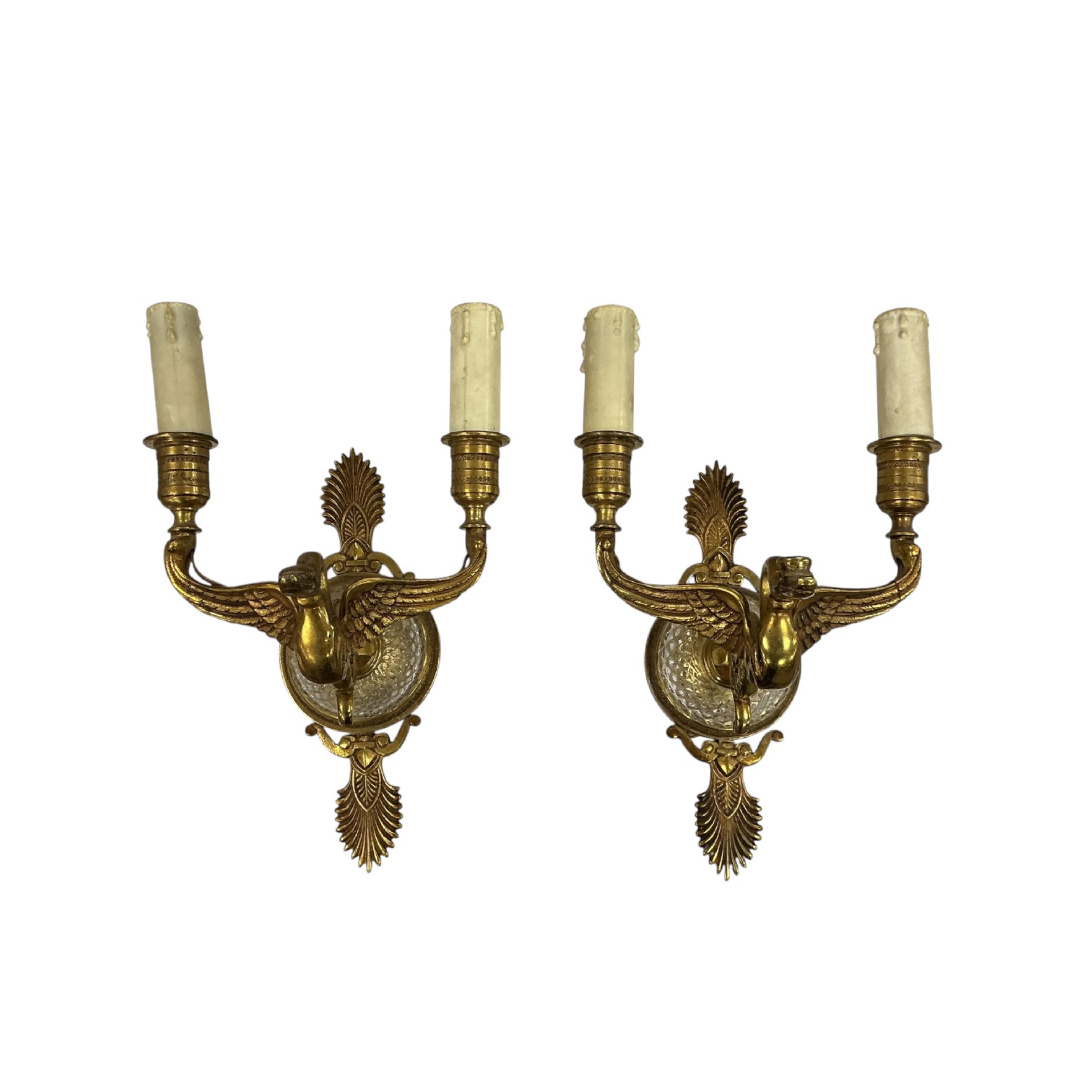 A pair of Empire style gilt brass and glass two branch wall lights, length 25cm.