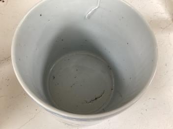 There is a hairline crack running from the top rim downwards, please see further images. Firing cracks to the inside of the base and some fritting throughout.