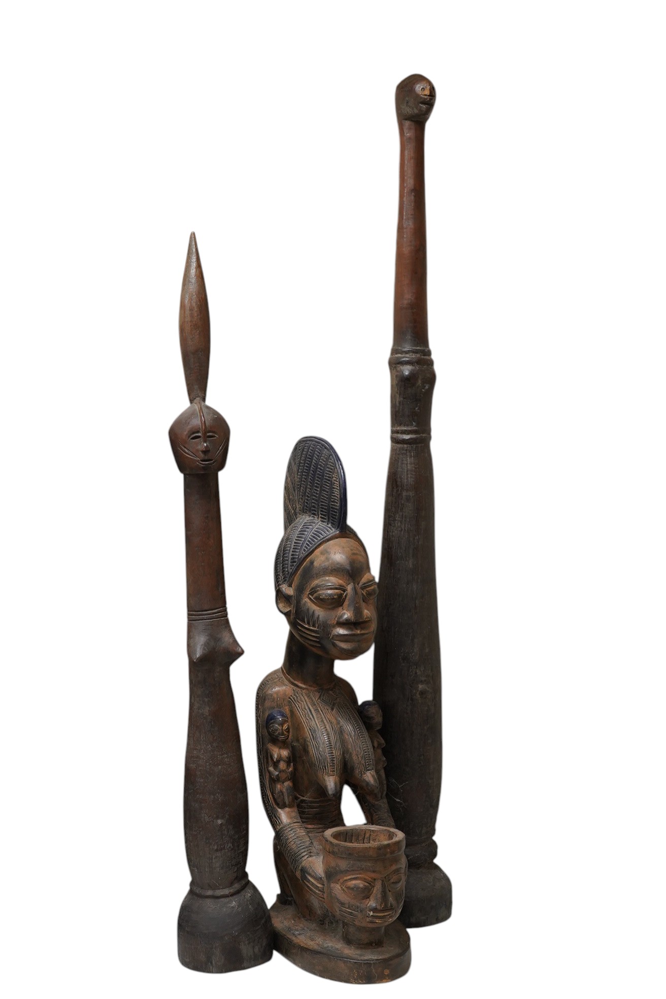 A large West African carved wood kneeling figure and two tribal poles, largest 120cm high