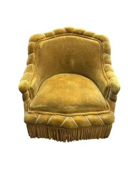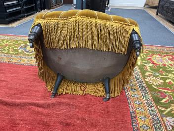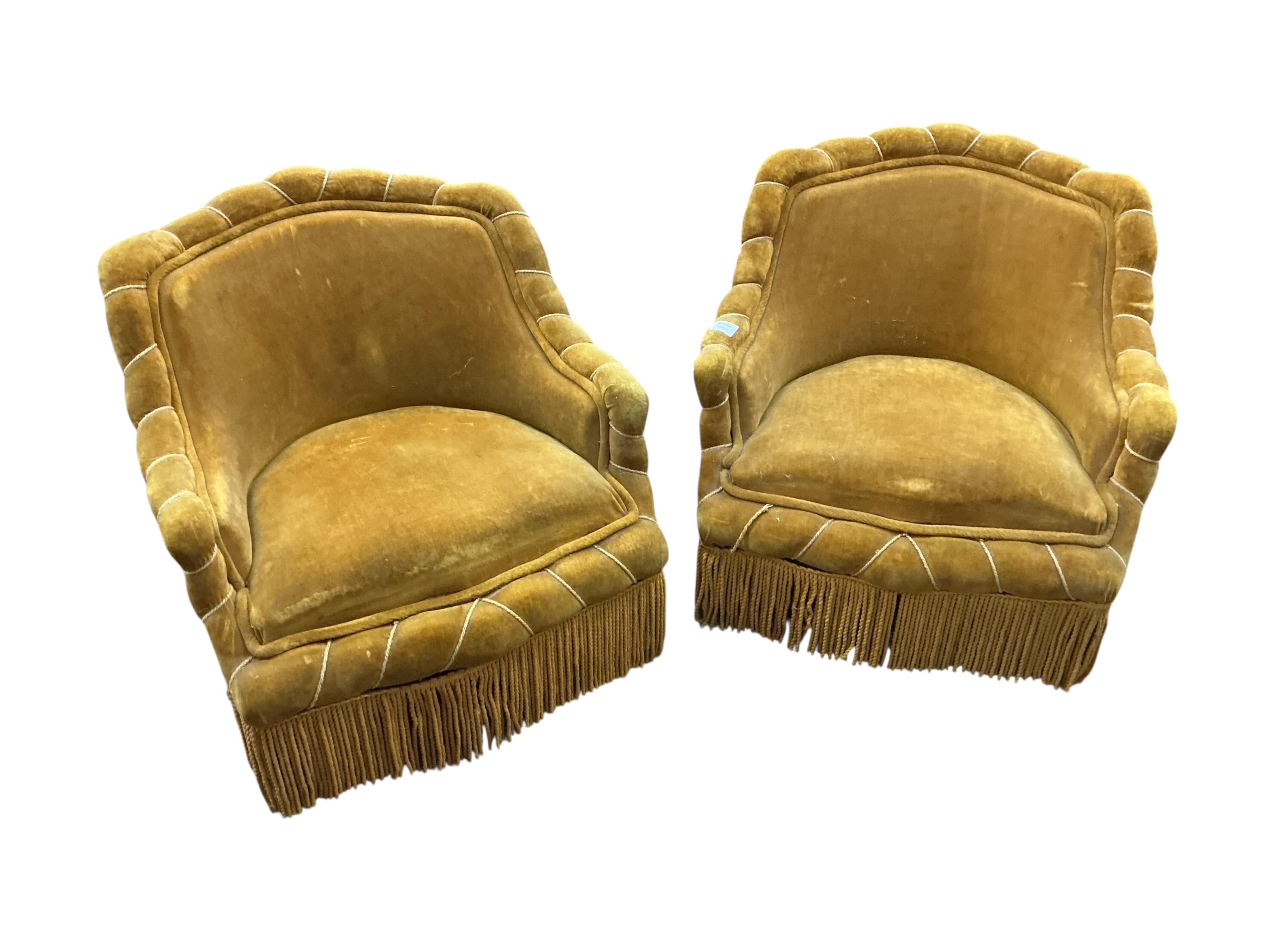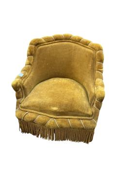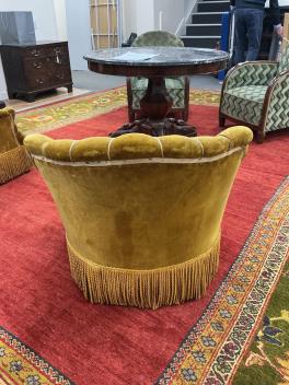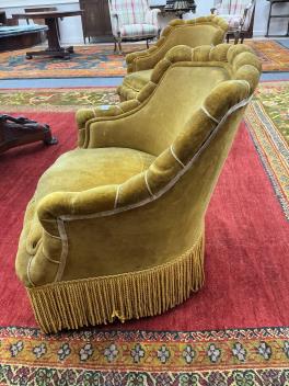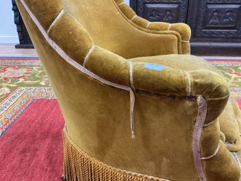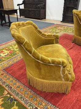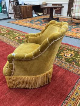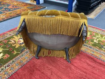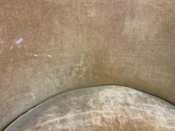 We believe these to be velour. Comfortable for a short period. They are sprung. Faded gold in colour. Worn and faded with some rips and holes. Extra images added on the Gorringe's website.