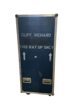 Sir Cliff Richard interest - a flight case on wheels used on the Cliff Richard tours from the mid 1980s until the most recent tour in 2025, in the form of a folding two-section wardrobe, containing hanging space on either side and one drawer, together with photographs of the flight case as set up in Sir Cliff’s dressing room, dimensions when closed; 157cm high, 136cm wide, and 64cm deep,