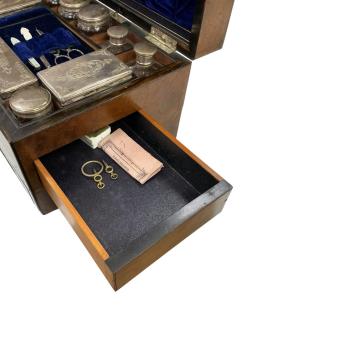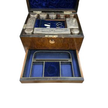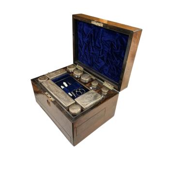 Lot 1332 , A Victorian coromandel wood fitted travelling dressing box, blue velvet interior with silver plated topped glass jars, other accessories, and a central tray of grooming implements, box height 19cm, width 30cm, depth 23cm