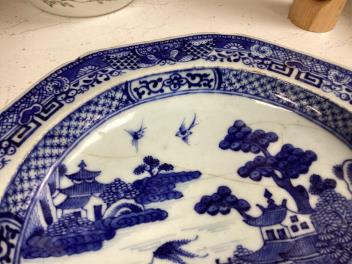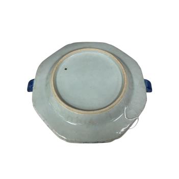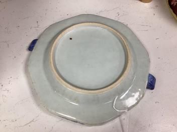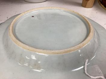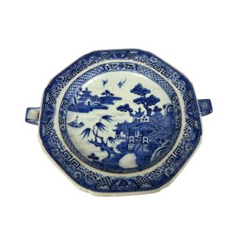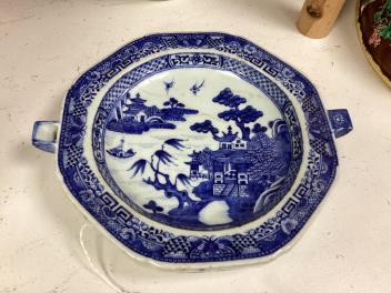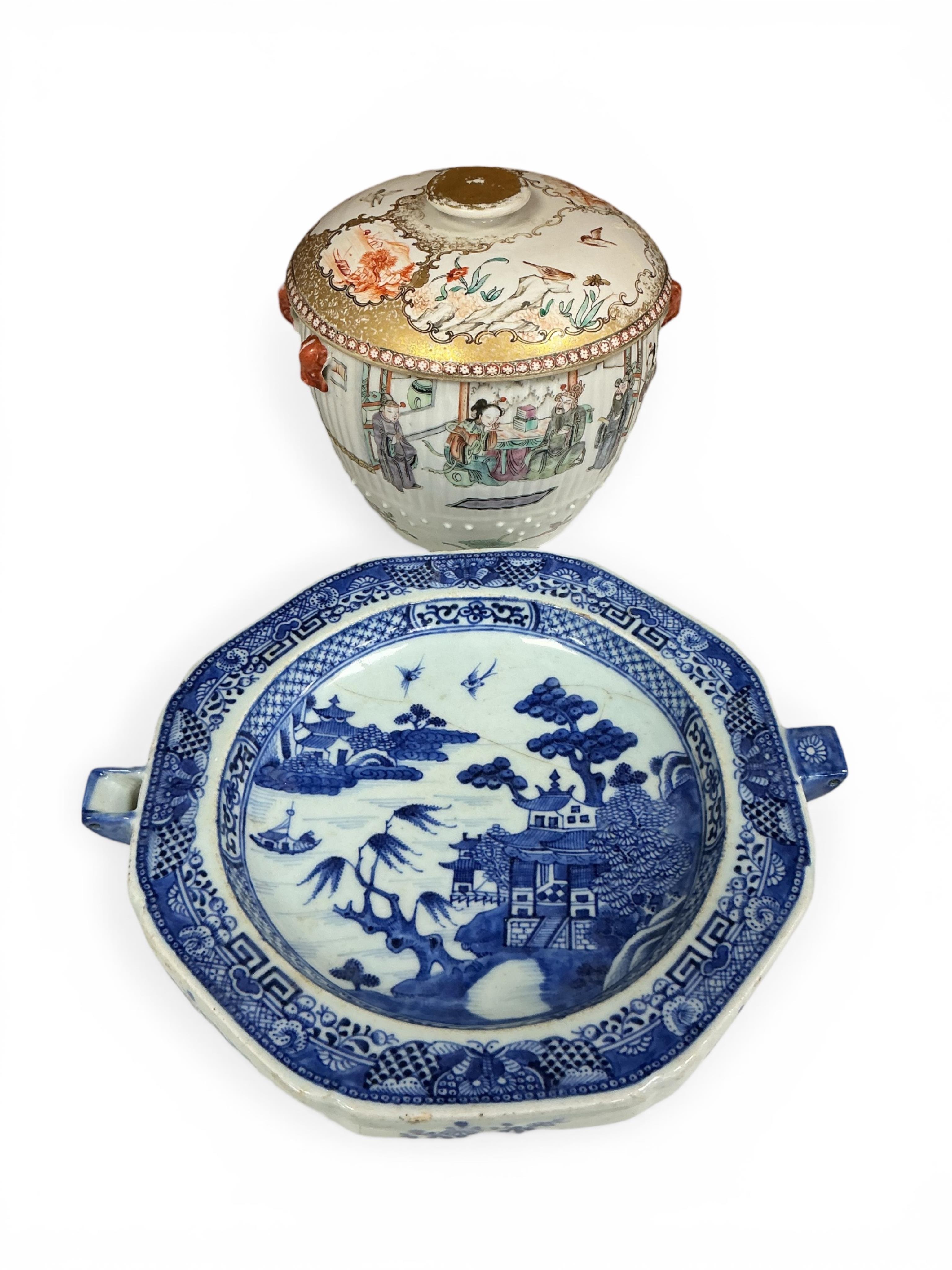 A Chinese porcelain jar and cover with a blue and white warming dish, jar height 17cm, dish diameter 23.5cm, (2).