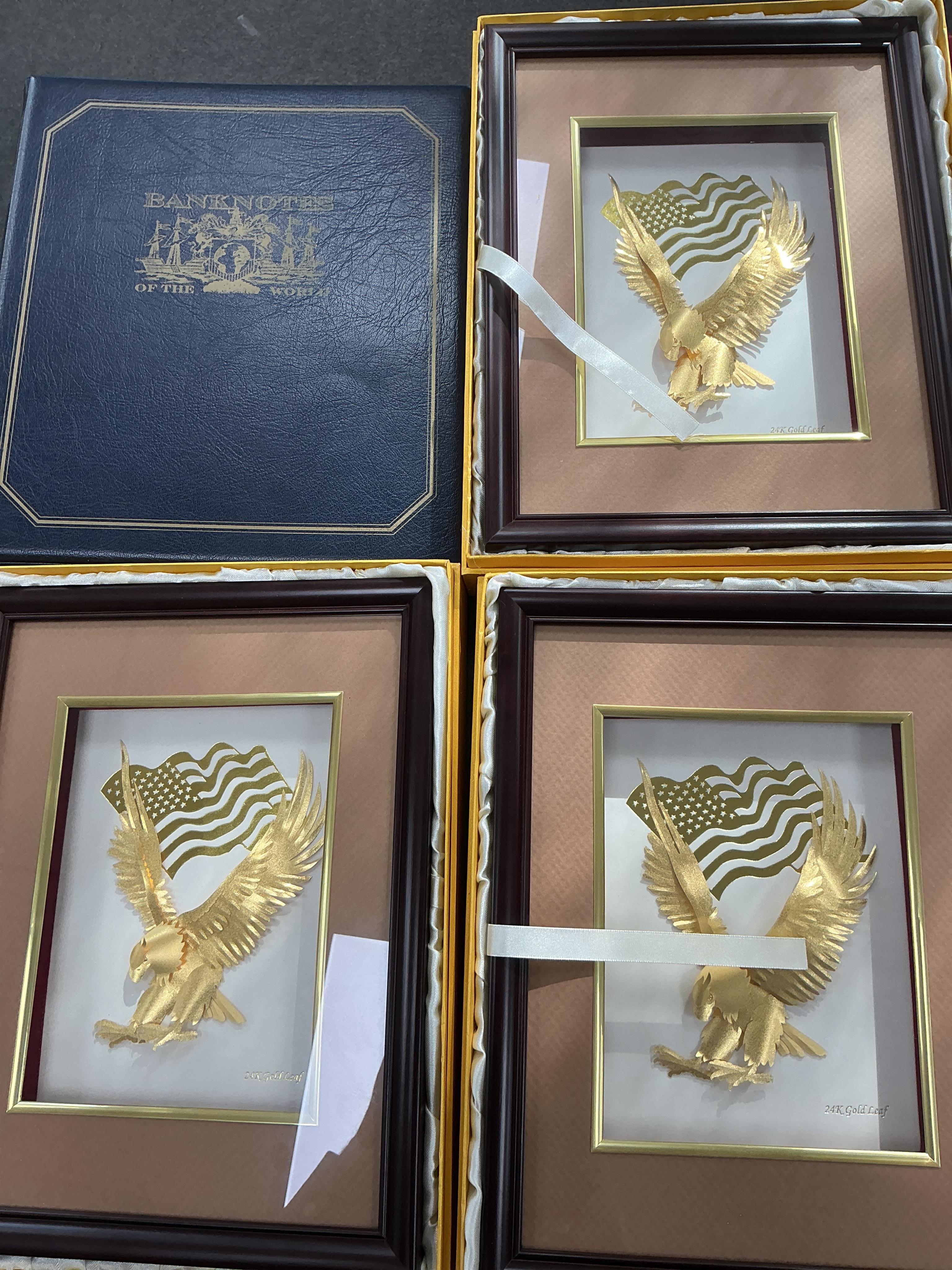 Three 24K gold leaf United States Golden Eagle collage pictures, each case, together with an album of bank notes of the world, pre-dating the change to euros