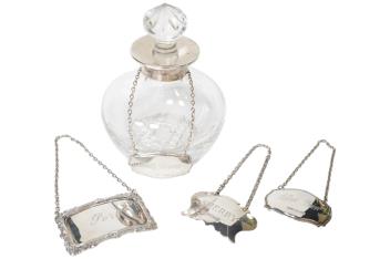 Lot 3852 , Four assorted modern silver wine labels including sloe gin, and sherry, together with a similar silver mounted glass scent bottle and stopper.