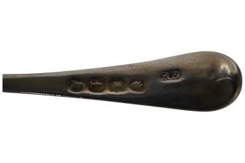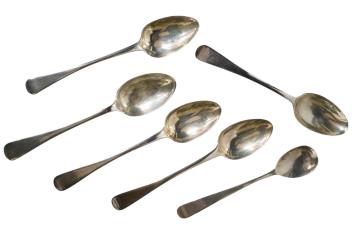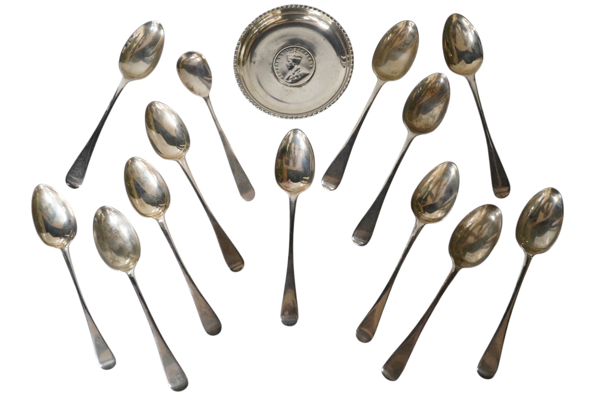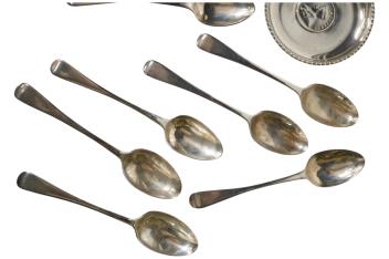 Lot 3853 , Two sets of six silver Old English pattern teaspoons, including London, 1820, together with a white metal small dish inset with Indian coin and a Georgian silver mustard spoon.