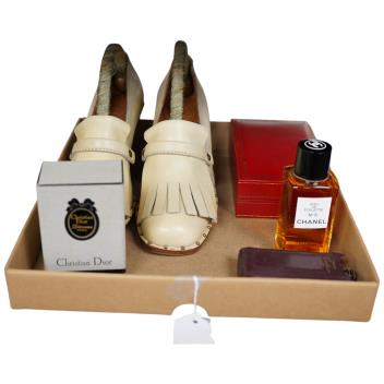 Lot 3192 , Christian Dior. A pair of vintage shoes & bottle of Diorama Paris perfume, together with a bottle of Must De Cartier Paris Parfum in original box, Chanel Eau De Toilette No.5, plus Cartier vintage leather pouch with empt