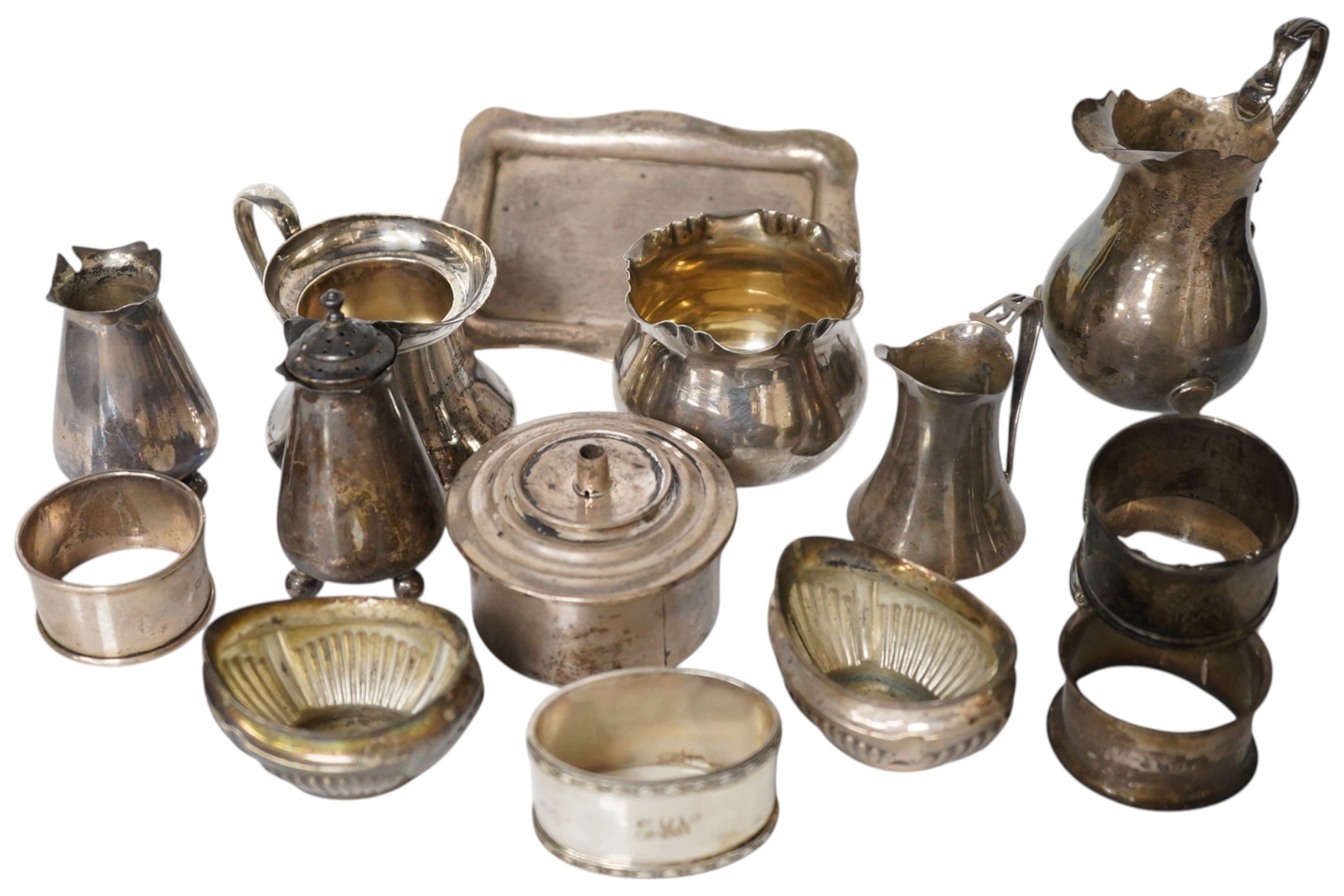 A small collection of assorted collectable silver including an Edwardian silver cream jug by Nathan & Hayes, Chester, 1908. height 10.7cm, a late Victorian silver butter shell, five napkin rings, two small cream jugs, four condiments, a small dish, Irish tea kettle burner, small bowl and a blue glass liner.