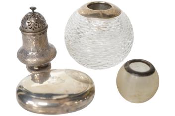 Lot 3868 , A late Victorian silver oval tobacco box, with engraved crest, Lawrence Emanuel, Birmingham, 1894, 83mm, together with a silver pepperette and two silver mounted glass match strikes.