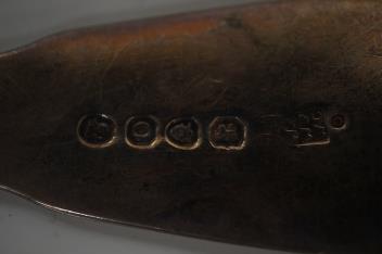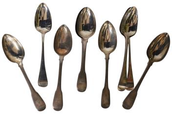 Lot 3871 , A matched set of six 19th century silver fiddle pattern table spoons, five by Eley, Fearn & Chawner, London, 1809 and five Old English pattern table spoons by Soloman Hougham, London, 1801, 22.9oz.