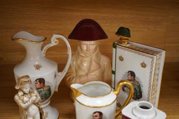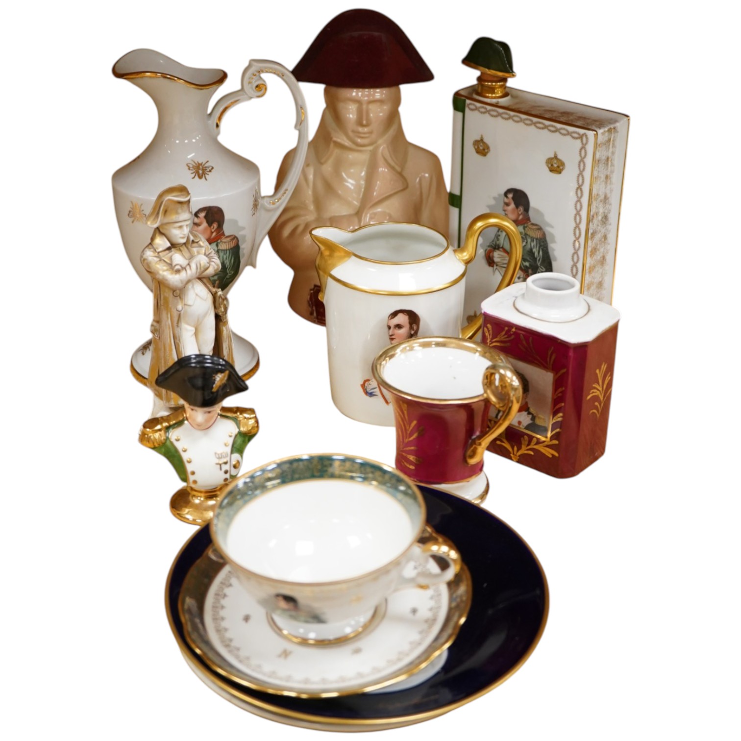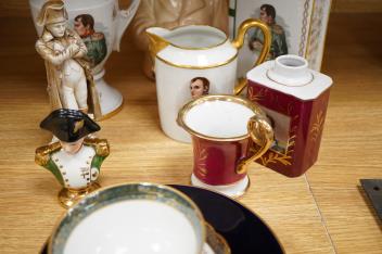 Lot 3600 , Napoleon interest , a group of commemorative ceramics including a Sitzendorf figure, height 17cm, two Limoges jugs and flask etc (10)