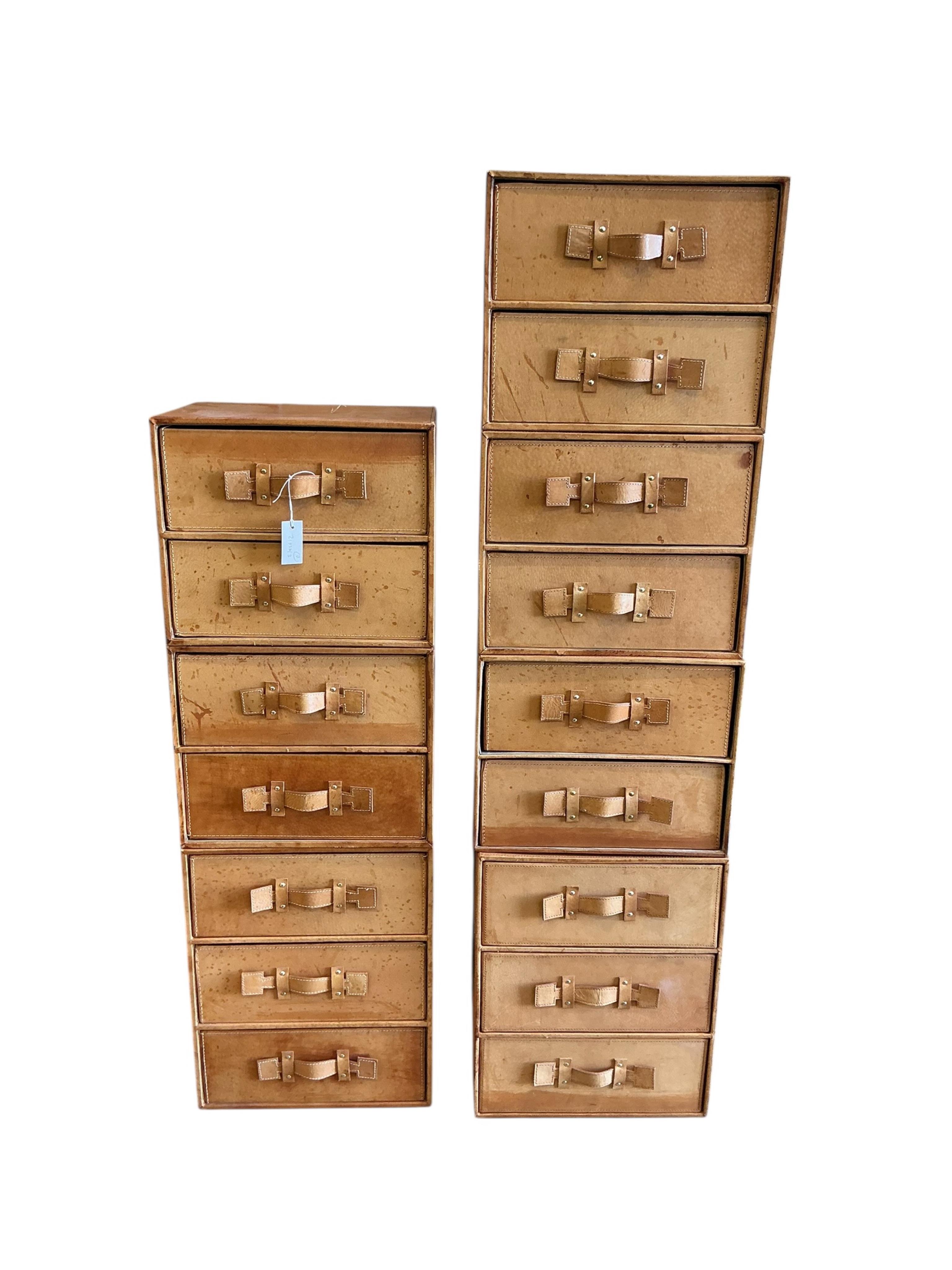 Seven pigskin covered storage drawer units in two sizes, larger width 44cm, depth 32cm, height 54cm