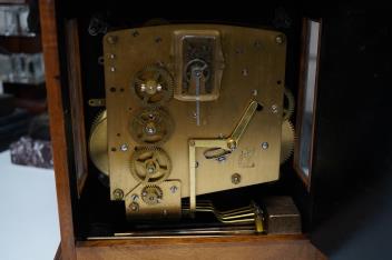 Lot 3621 , A modern three train mantel clock by Garrard & Co., with a balance escapement, striking and chiming on four gongs, presentation plaque below the face dated 1955, 30cm high