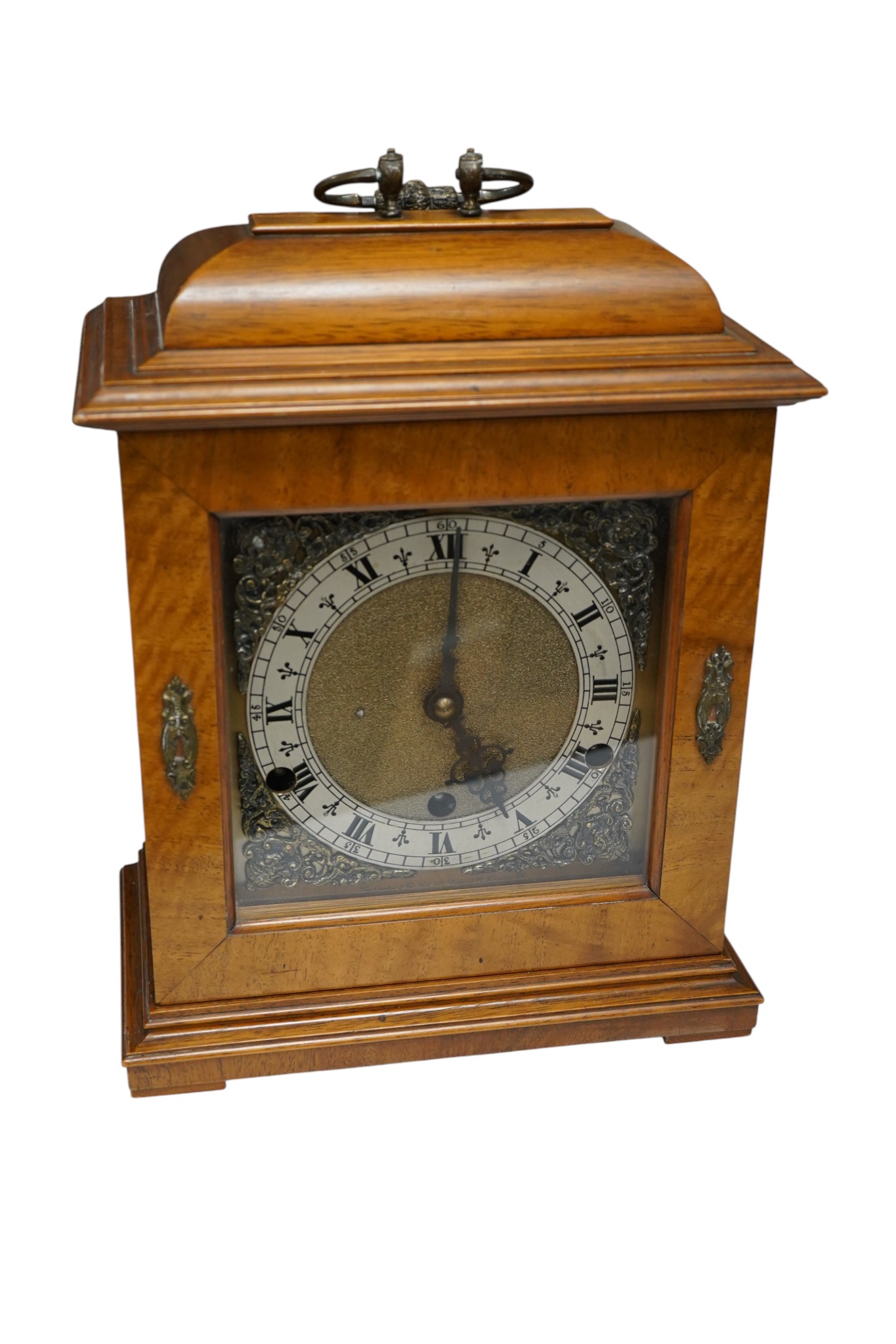 A modern three train mantel clock by Garrard & Co., with a balance escapement, striking and chiming on four gongs, presentation plaque below the face dated 1955, 30cm high