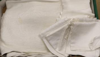 A damask linen table cloth with swan design,