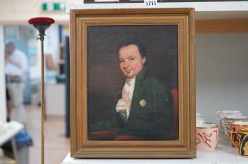 Lot 1710 , 18th century, English School, Portrait of a gentleman wearing a green frock coat, unsigned, oil on canvas, 17 x 21cm