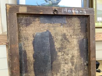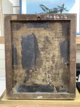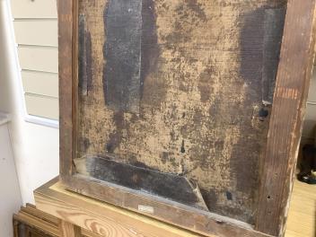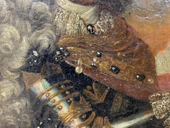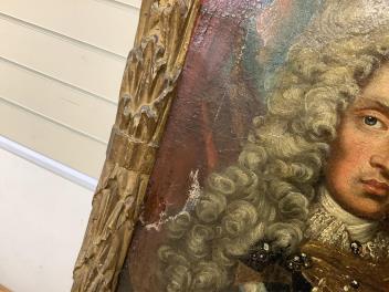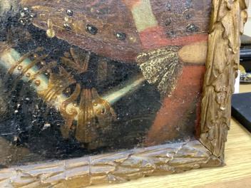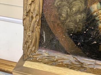 Several tears to canvas, some of which with old tape-repairs applied verso, see images; craquelure and bitumen deposits throughout. Carved giltwood frame with obvious wear, knocks; mitre joints no longer tight-fitting. No inscriptions or helpful clues verso.